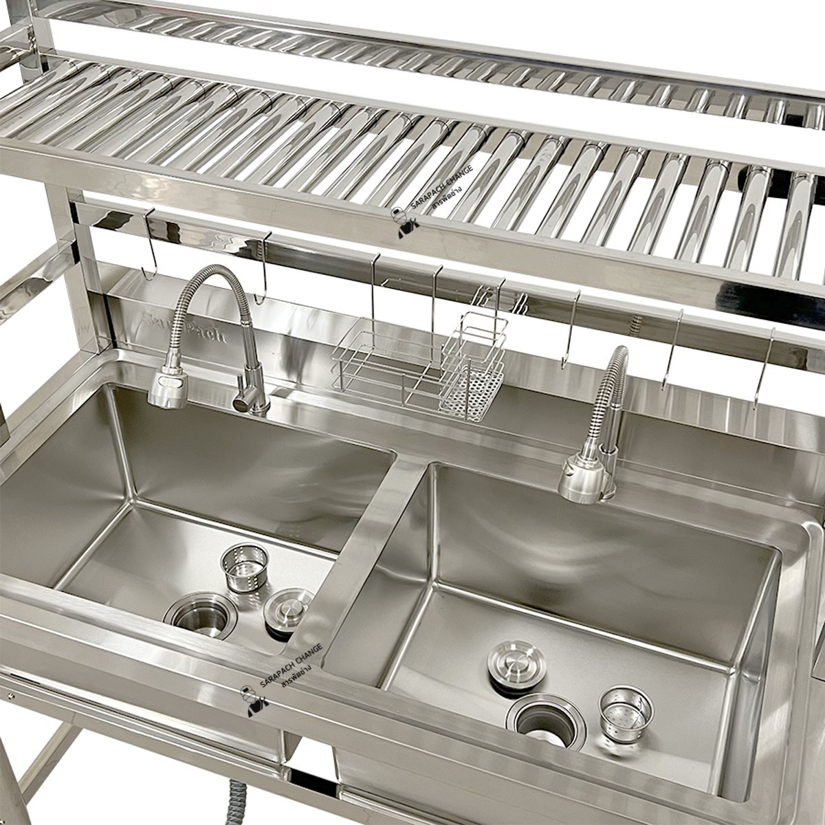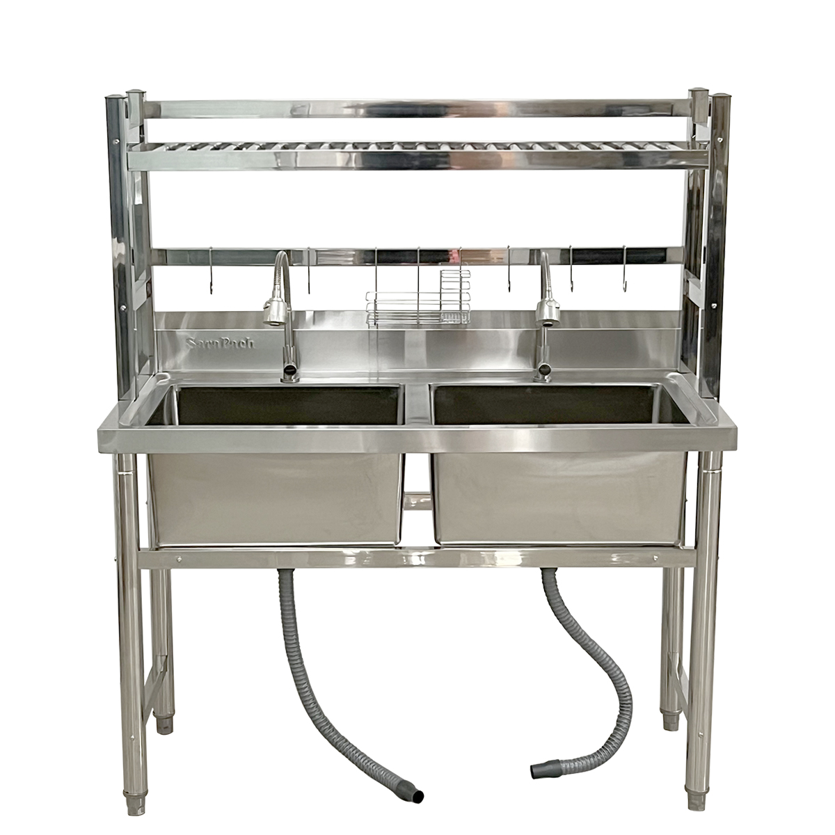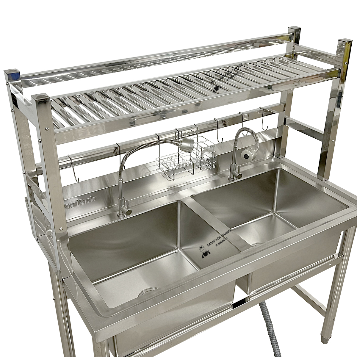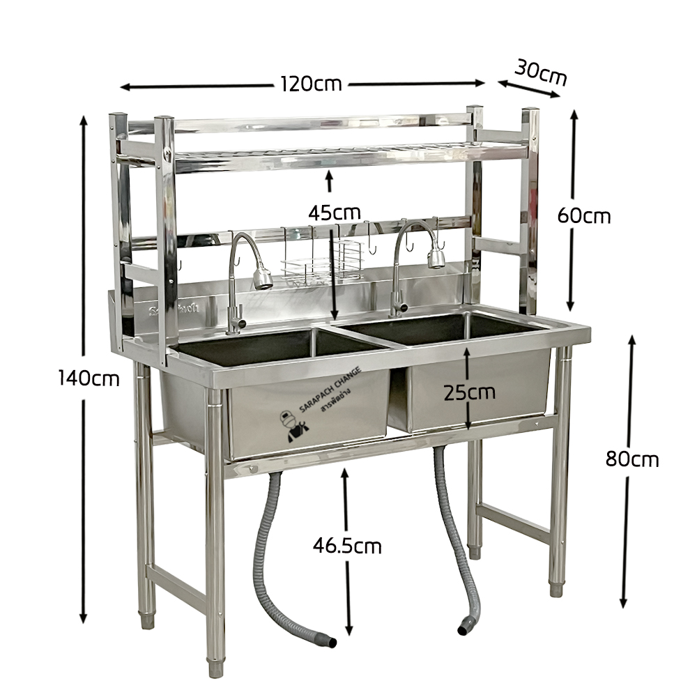 คุณสมบัติ ซิงค์ล้างจานสแตนเลส 2 หลุมพร้อมชั้นคว่ำจาน - ขนาดสินค้า 120x60x140 ซม. - ขนาดพื้นที่คว่ำจาน 24*113 ซม. - ชั้นคว่ำจานสูงจากซิงค์ 45 ซม. - มีตะขอจำนวน 4 ชิ้น สูงจากซิงค์ 25 ซม. - โครงทำจากสแตนเลสขนาก 4*4 ซม. คานคว่ำจานทำจาก - คานคว่ำจานทำจากสแตนเลสขนาด 3 ซม. แข็งแรงมาก