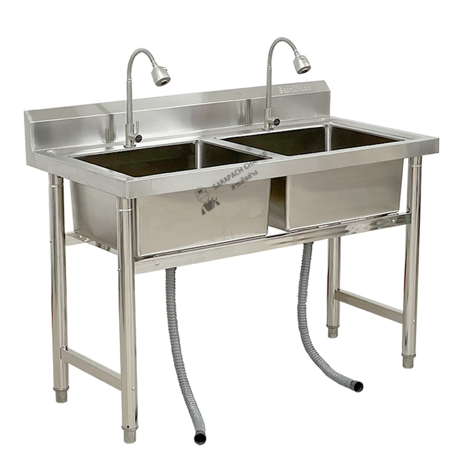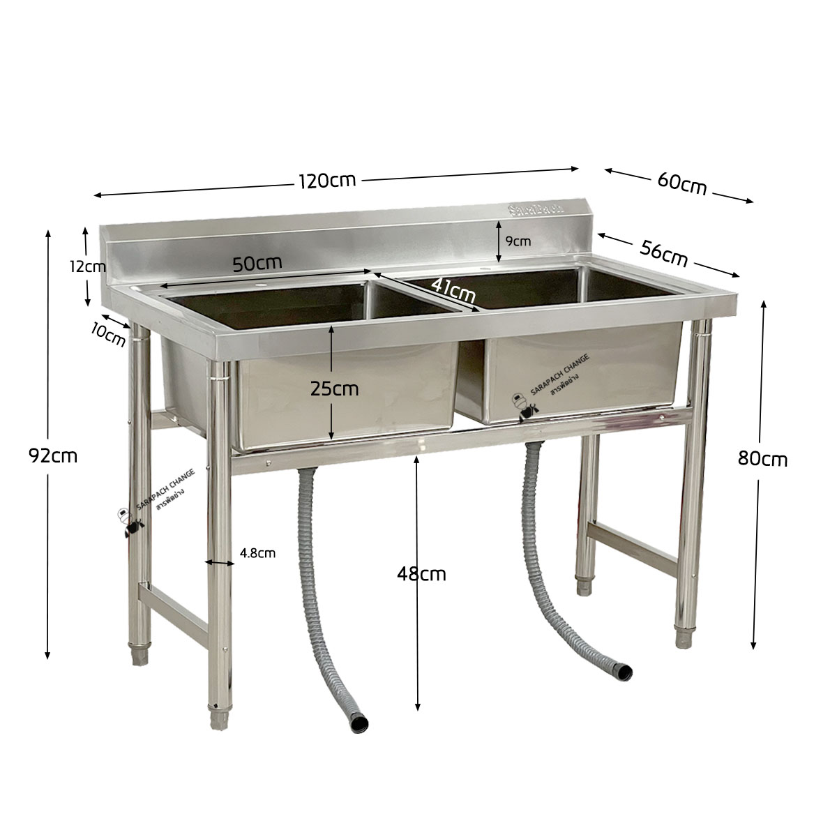 คุณสมบัติ ซิงค์ล้างจานสแตนเลส 2 หลุม - ขนาดซิงค์ 120x60x80 ซม. - ขนาดหลุม 41x50x25cm - น้ำหนักสินค้า 18 กก. ถึง 35 กก. ขึ้นอยู่กับแบบ - ทำจากสแตนเลส 201 หนา: 0.8-1 mm - มีรูสำหรับใส่ก๊อกน้ำขนาด 2.5 cm // รูน้ำทิ้ง ขนาด 4 นิ้ว - รับน้ำหนักได้ 180 กีโล